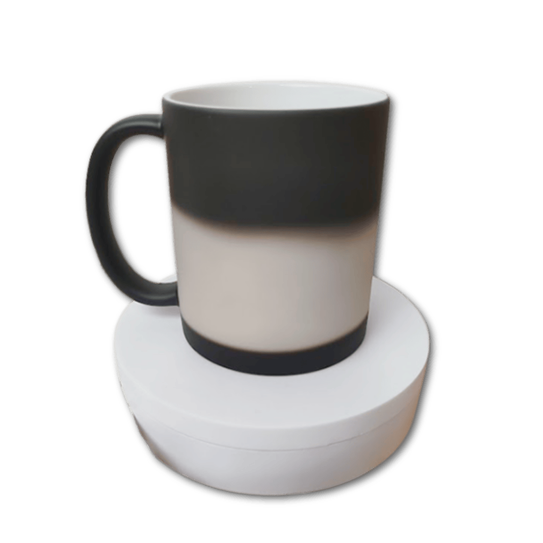 A Caneca Mágica funciona através de um revestimento termo-sensível, que permanece preto quando fria e revela a arte estampada assim que entra em contato com calor.