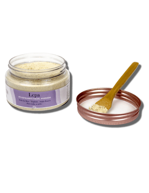 O Esfoliante Lepa é um Blend de pós cosméticos e fitoterápicos, combinação de Grão de Bico, Argila branca, Dolomita, Triphala (semente de três frutas indianas, consideradas rejuvenescedoras) e Cúrcuma.